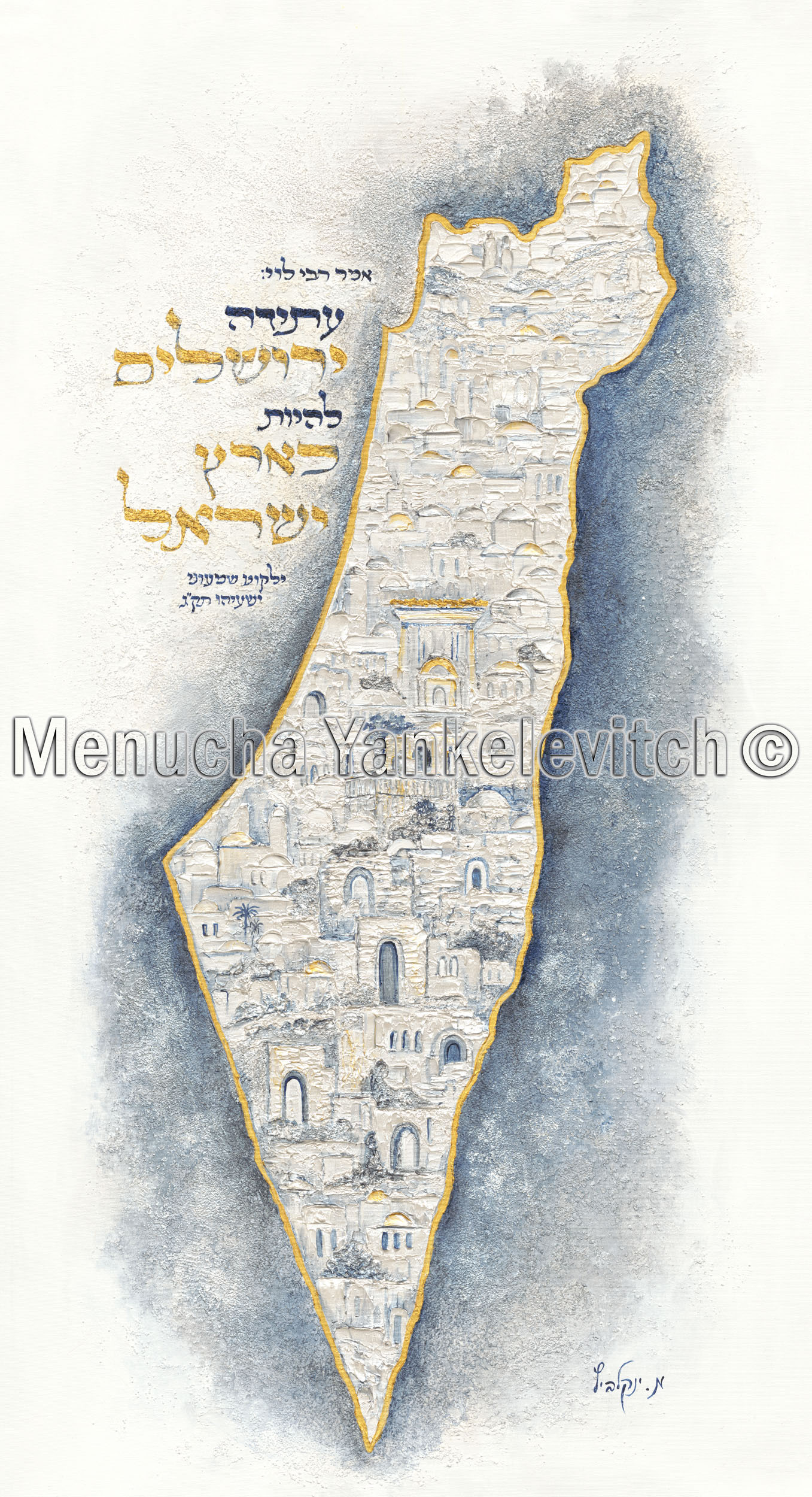 In this painting, I filled the modern borders of the land with the houses of Jerusalem, symbolizing the city’s spiritual expansion across the entire country. The piece was created using mixed media, with a unique texture in silvery tones that add dignity and sanctity.