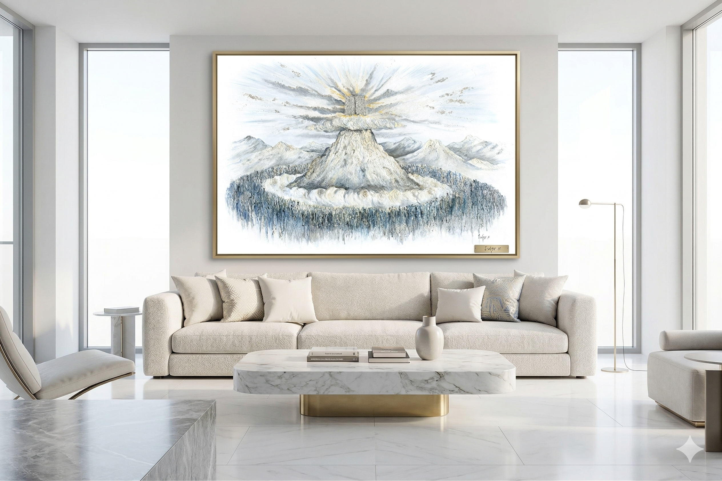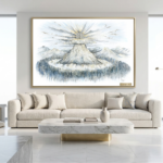 סגנון ואווירה היצירה מתאפיינת בטכניקה ייחודית של שכבות ומרקמים, המעניקה לציור עומק תלת-ממדי מוחשי. השילוב בין גווני הלבן הבוהק, האפורים והנגיעות הצבעוניות בבסיס ההר, יוצר הרמוניה ויזואלית שמרגיעה את הנפש מחד, ומעוררת השראה מאידך.