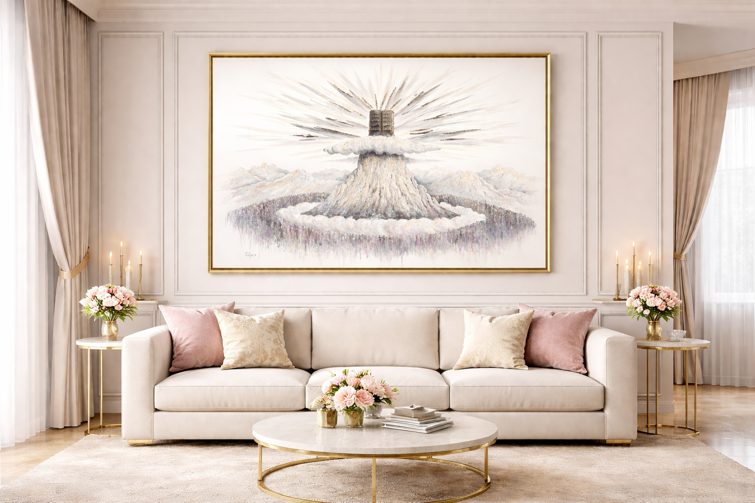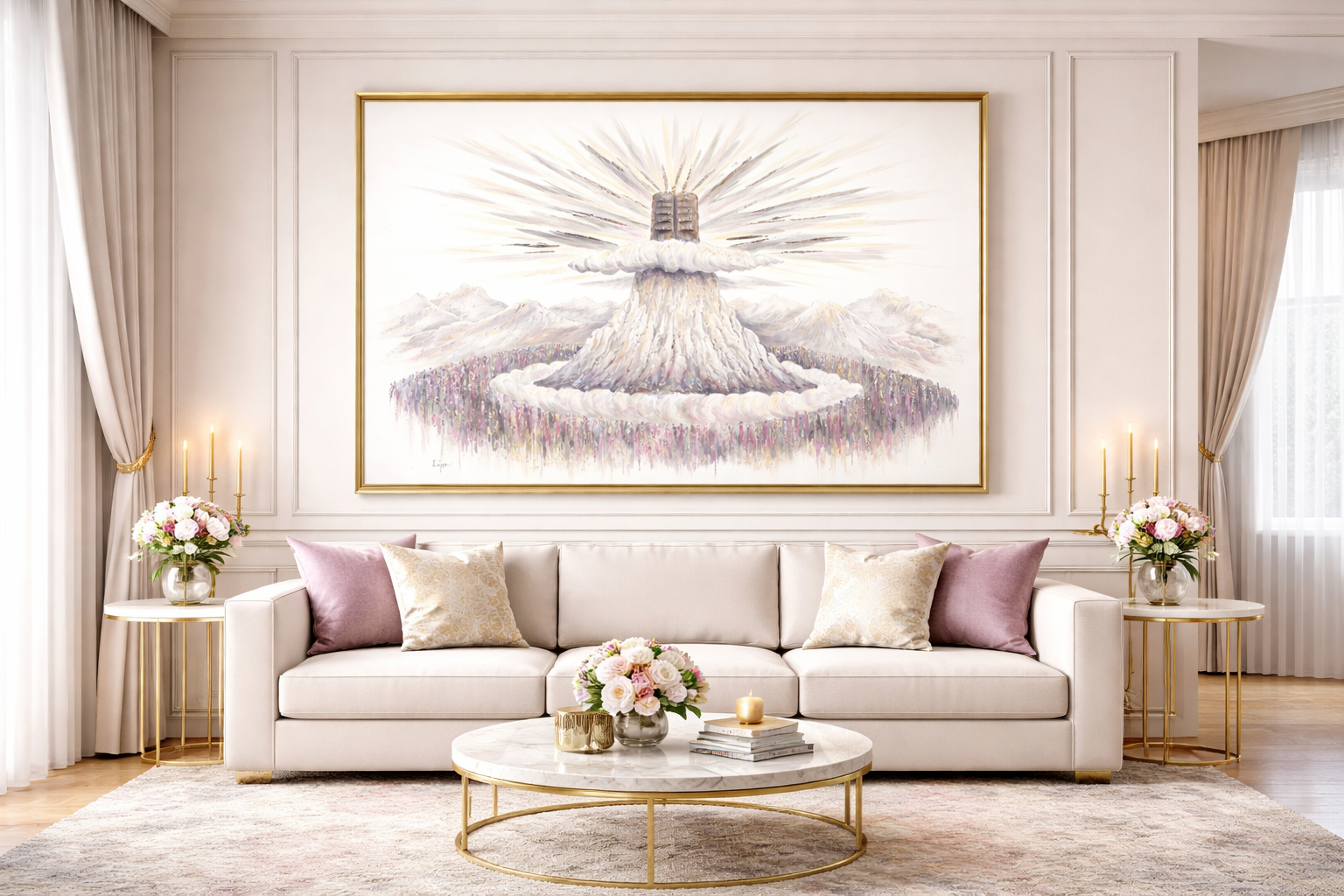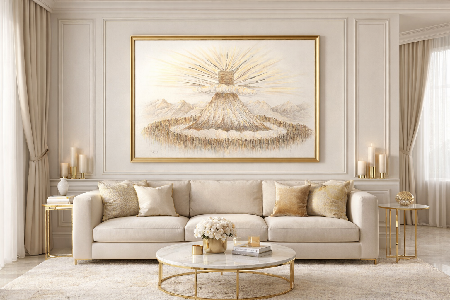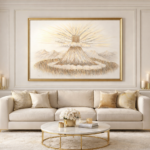 יצירה עוצמתית ומרגשת זו מפיחה חיים ברגע המכונן ביותר בתולדות עם ישראל – מעמד הר סיני. הציור לוכד את המעמד המקודש של ההתגלות האלוקית, ומזמין את המתבונן לחוות מחדש את יראת הרוממות של קבלת התורה.