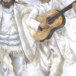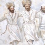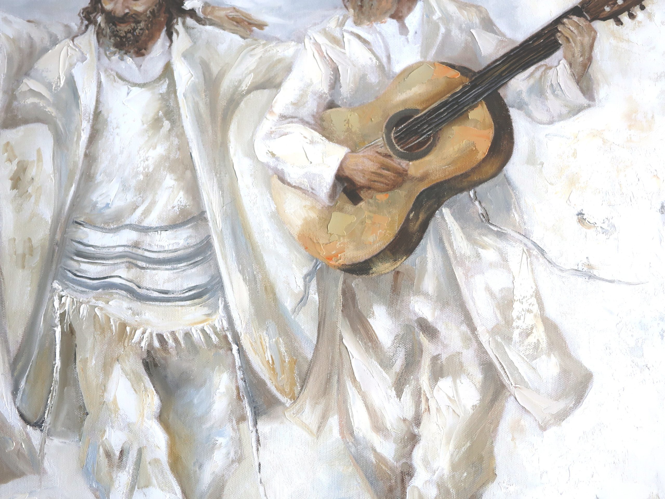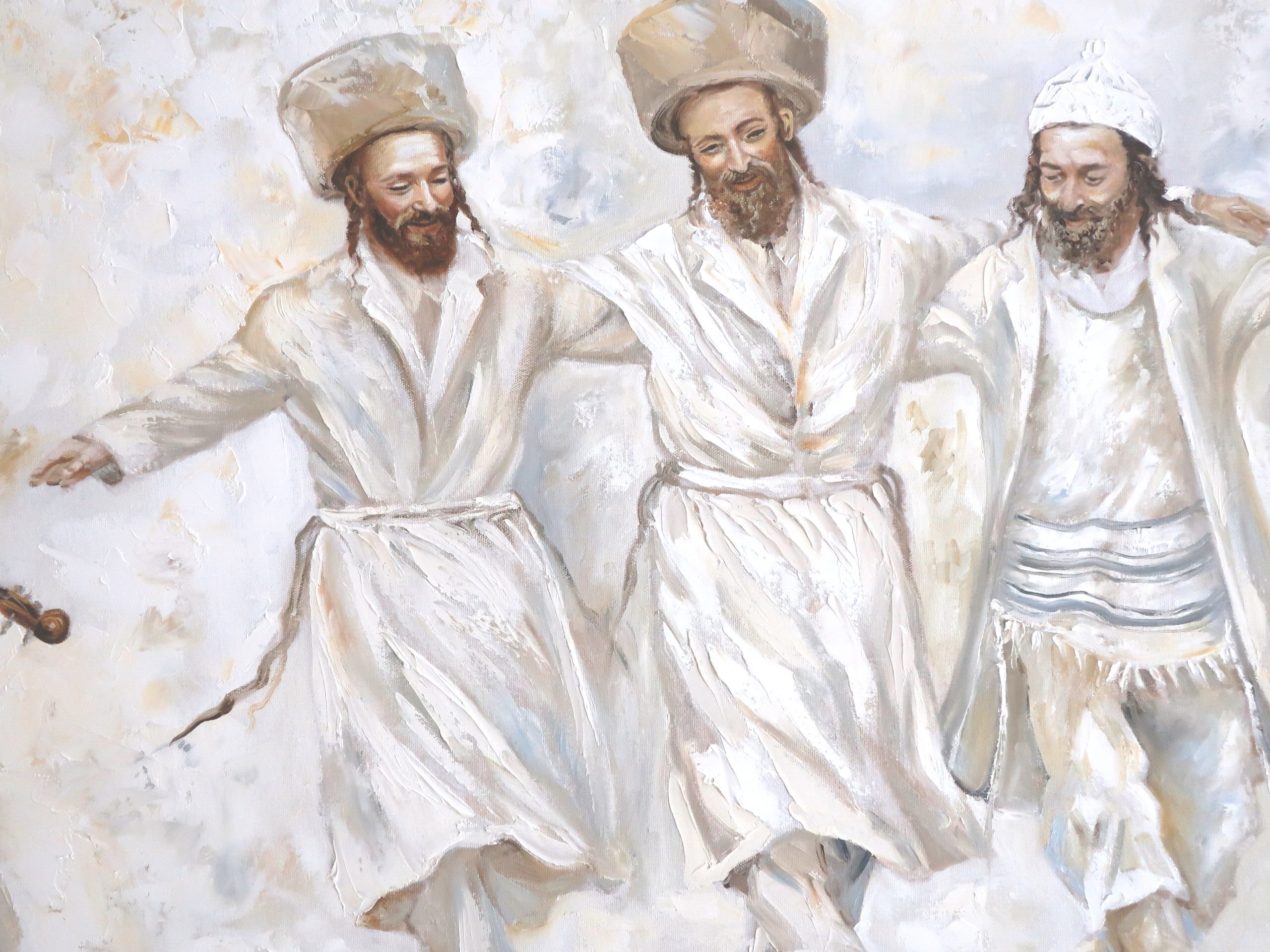 תיאור היצירה: יצירה פנורמית מרהיבת עין הלוקחת את הצופה אל תוך עולם של דבקות ושמחה יהודית. הציור מתאר חבורת חסידים הלבושים בגדי לבן חגיגיים (קיטלים או קפוטות שבת), המשלבים בין נגינה בכינור וגיטרה לבין מחול אקסטטי. הדמויות הקורנות על רקע בהיר ומואר יוצרות תחושה של התעלות מעל החומר וחיבור לעולם הרוח.