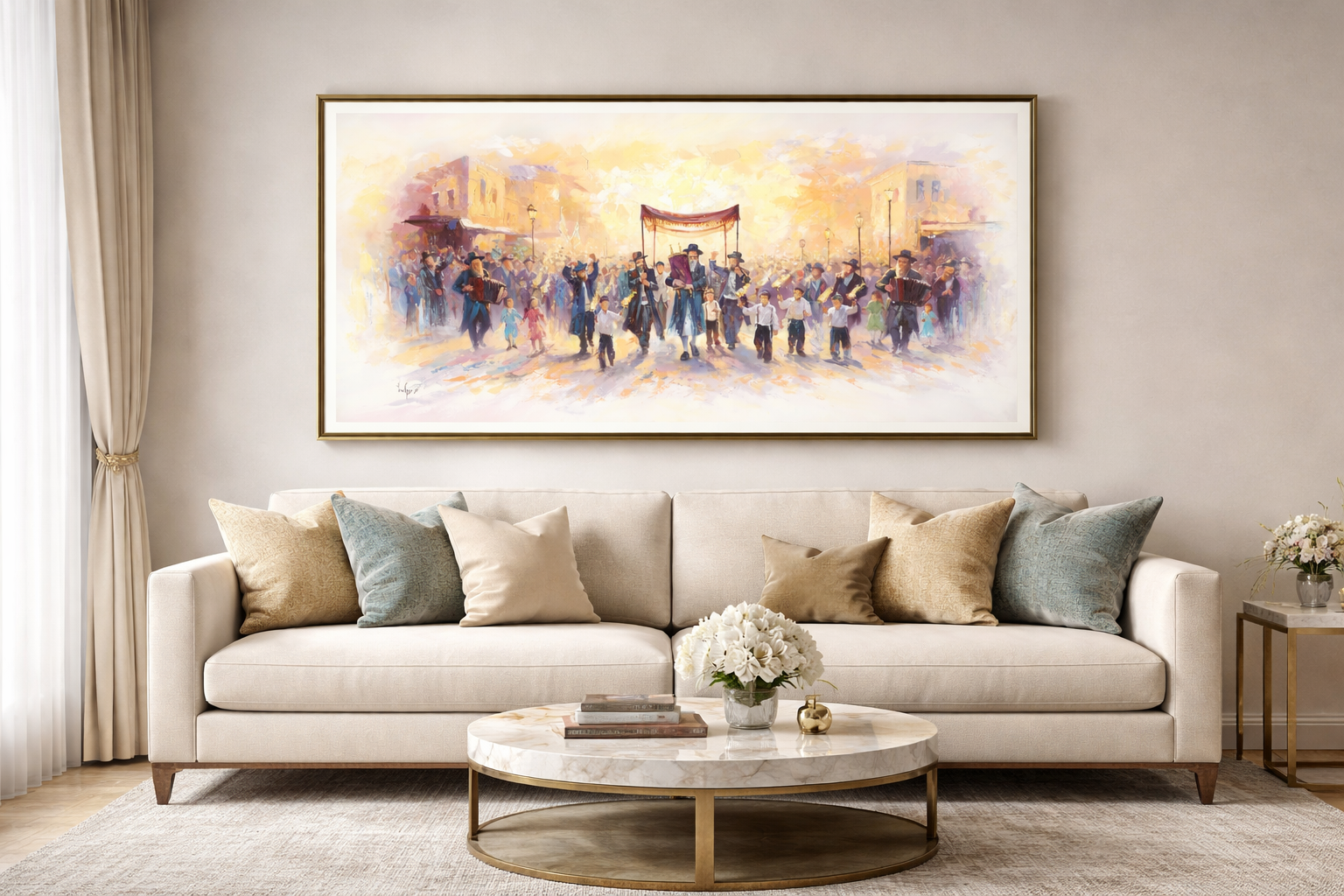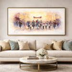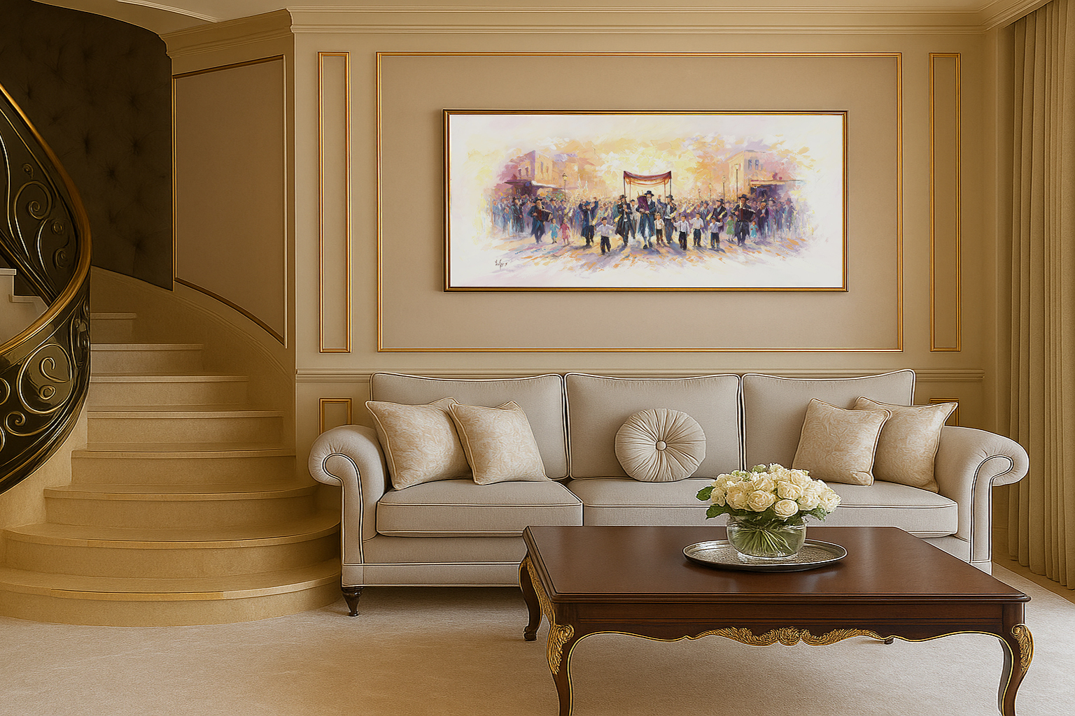This painting captures a vibrant and moving Torah procession, as a new Torah is joyfully carried through the streets of the city. Men, women, and children come together to dance and celebrate in honor of the Torah. Children walk proudly with torches in their hands, songs of Torah and joy filling the air, as the entire crowd is swept up in a uniquely Jewish celebration — pure, alive, and full of light, a joy that spills beyond boundaries and illuminates the whole space.