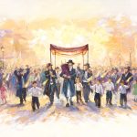 The painting is bathed in warm, radiant tones — golden hues, soft yellows, and glowing light that wash over the street, creating a sense of warmth, vitality, and sacred presence, as if holiness itself is descending into the city and filling every corner.