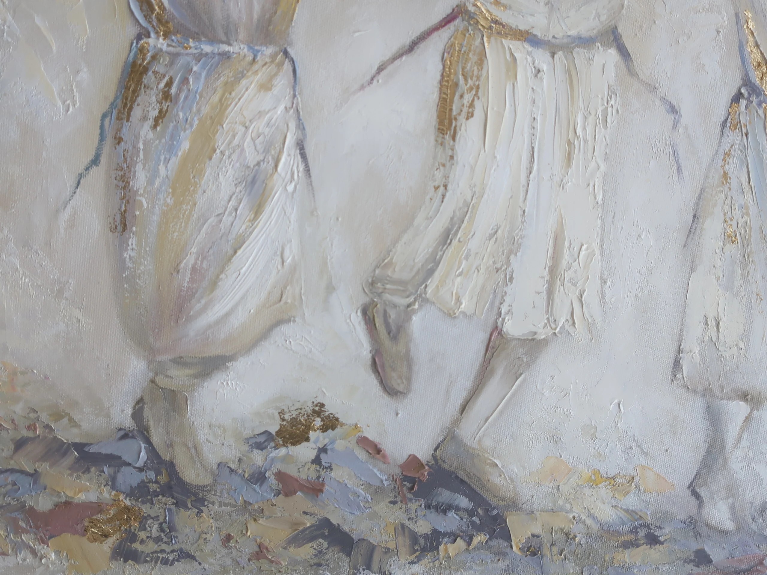 Technique and Style: Executed in oil paints with a high-texture Impasto technique, the artwork provides tangible volume and depth to the garments and traditional Shtreimels. A unique highlight of this painting is the integration of gold accents and vibrant colors (yellow, blue, and red) at the base and throughout the background, symbolizing sparks of holiness bursting from the earth during the dance. The bright, ethereal background makes the figures appear as if they are part of an uplifting spiritual vision.