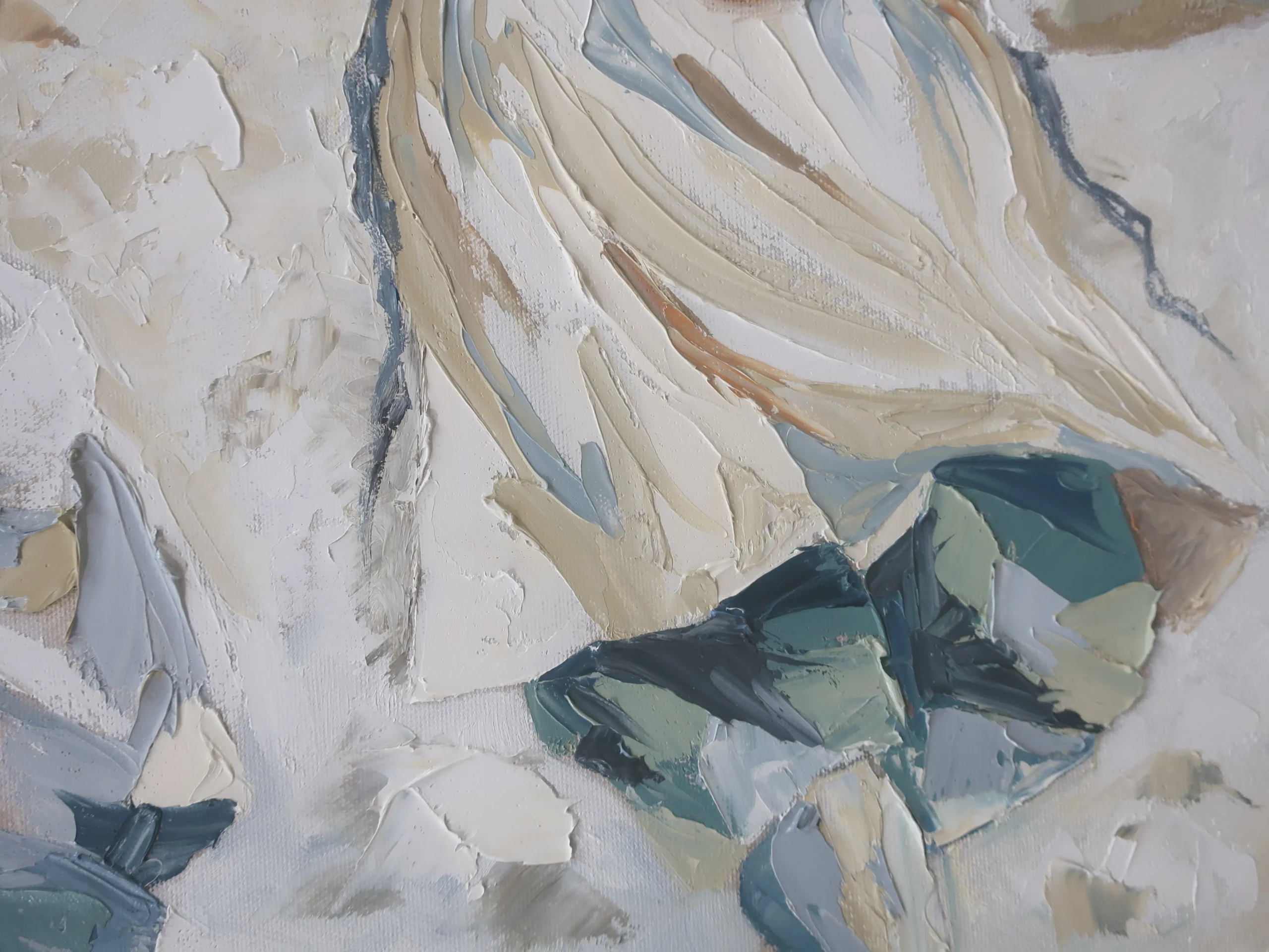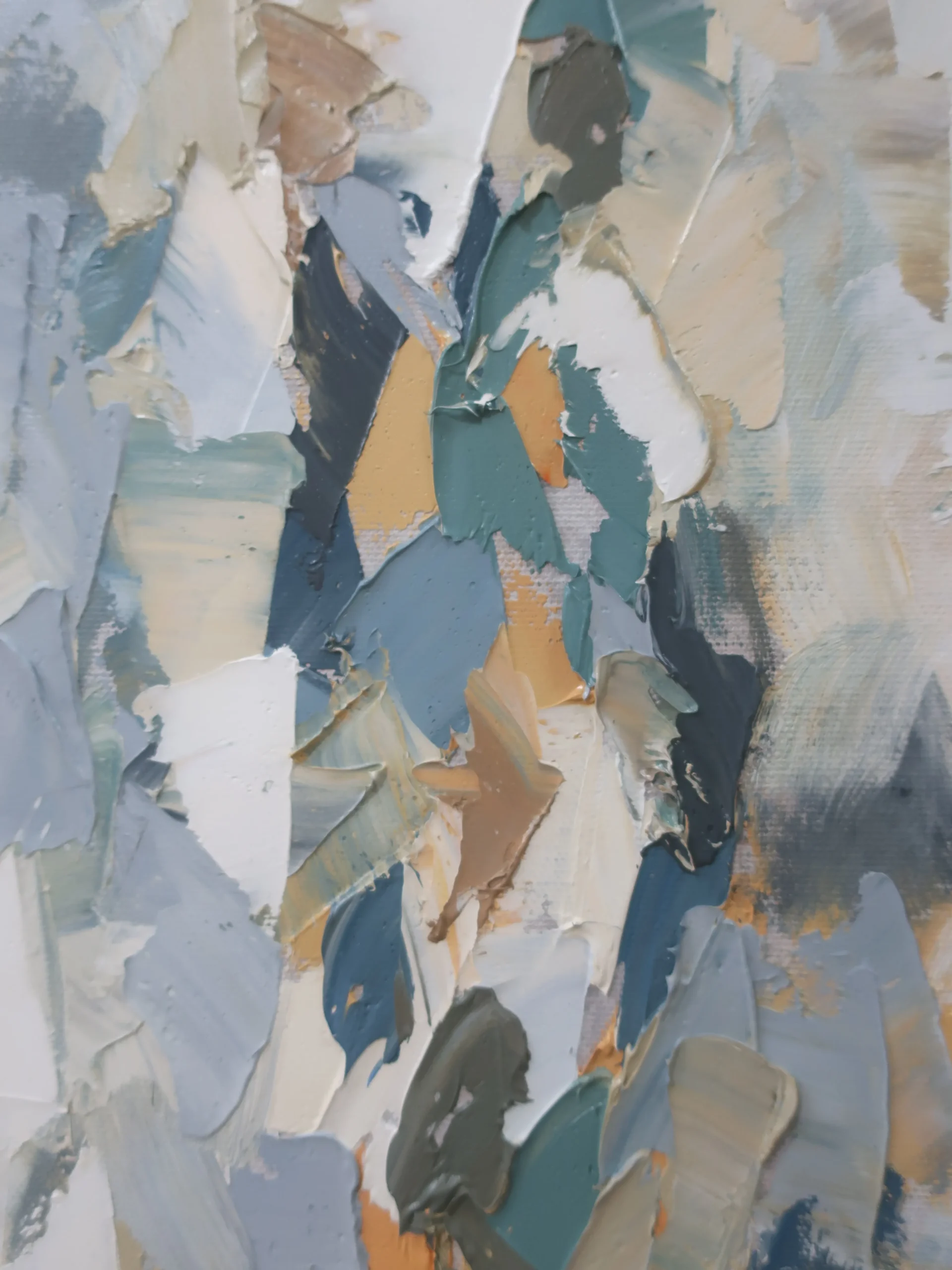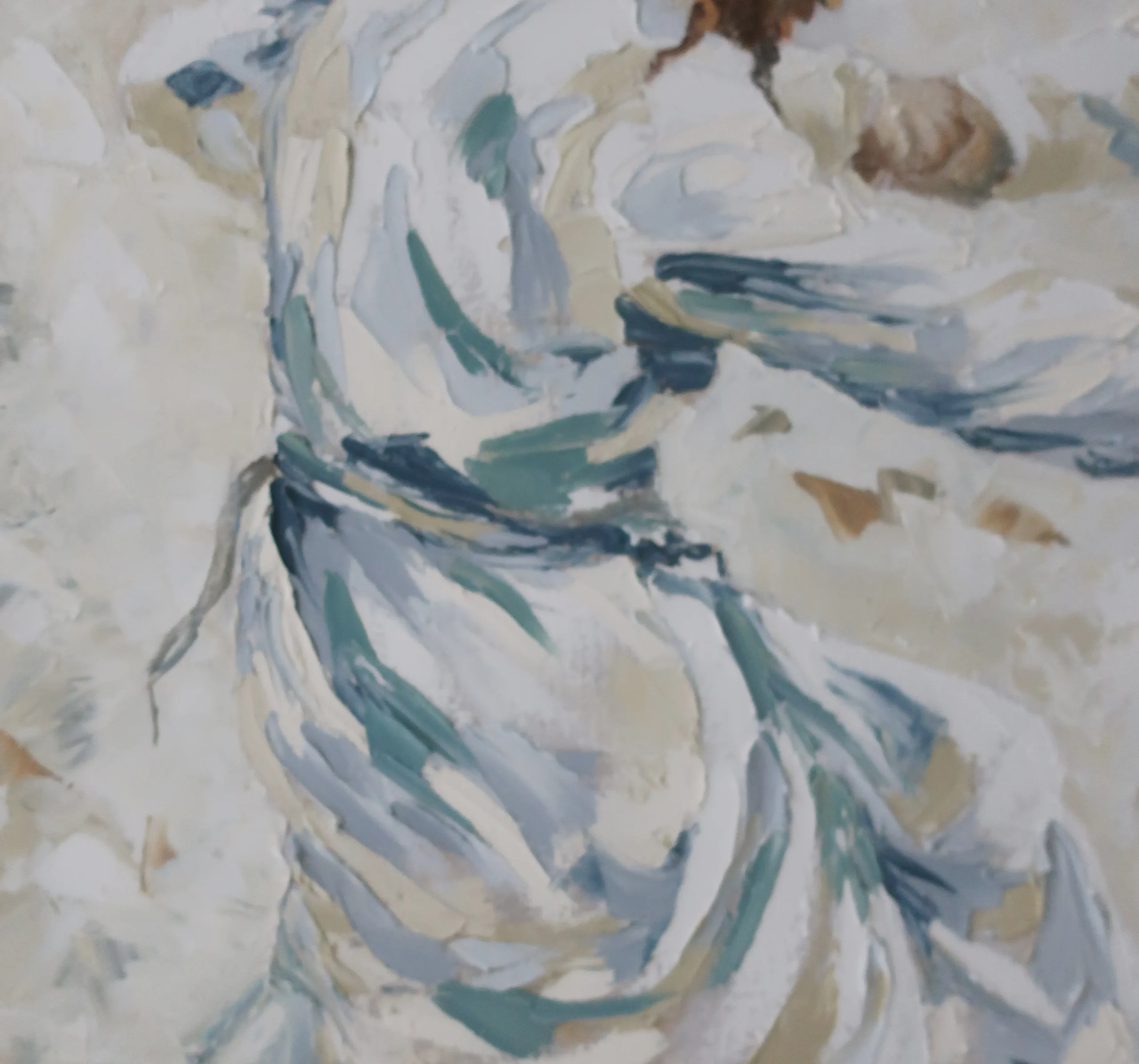 Technique and Style: The painting is executed in oils with high-texture Impasto. Bold brushstrokes and palette knife work create a three-dimensional feel on the canvas, allowing you to sense the thickness of the paint and the energy invested in every motion. The bright, abstract background, along with the dynamic “splashes” of color at the dancers’ feet, highlights the figures and makes them appear to float right off the canvas in a moment of spiritual uplift.