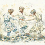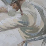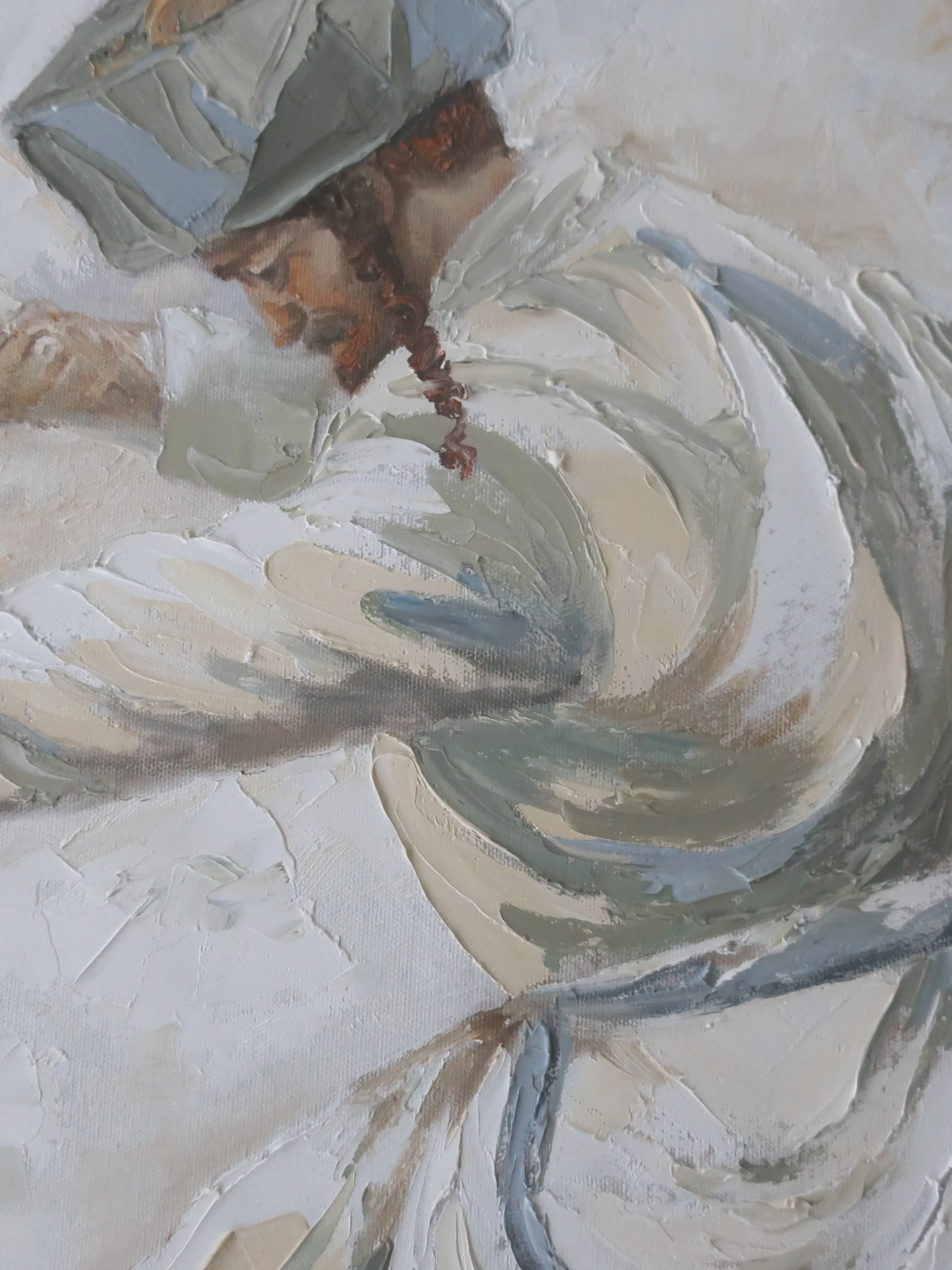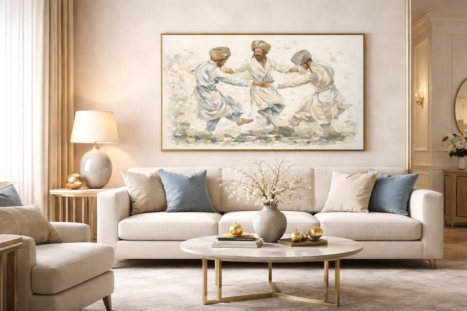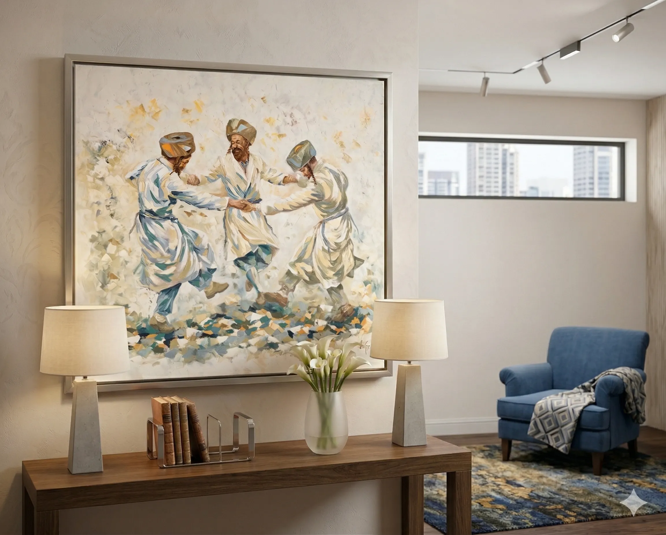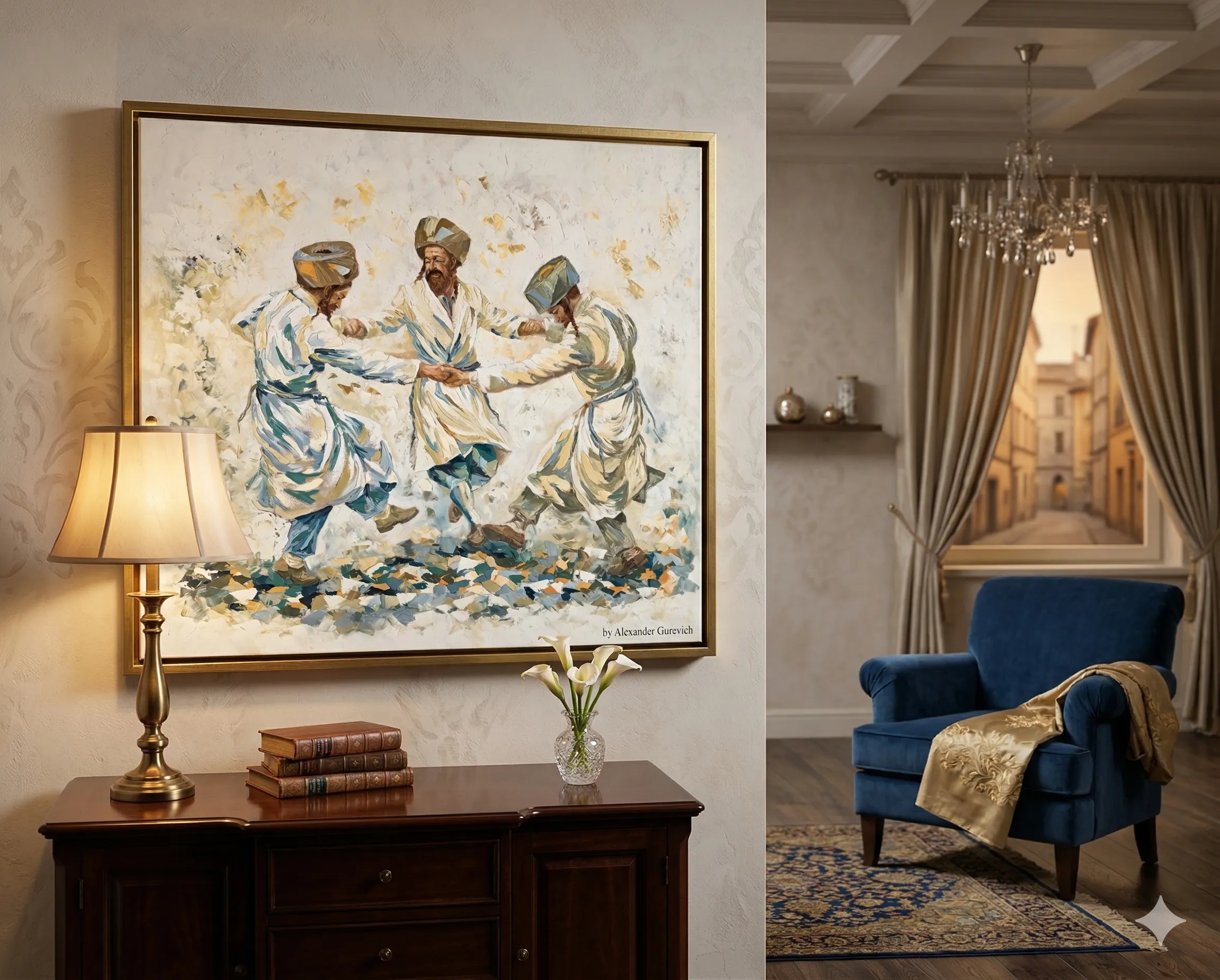 Artwork Overview: This powerful piece captures a pure moment of spiritual elevation and boundless, authentic Jewish joy. At the center of the painting, three Hasidim hold hands, dancing in a circle that expresses unity and religious ecstasy. The figures are rendered with a wonderful blend of realistic detail and modern artistic freedom, giving the painting a sense of continuous life and movement.