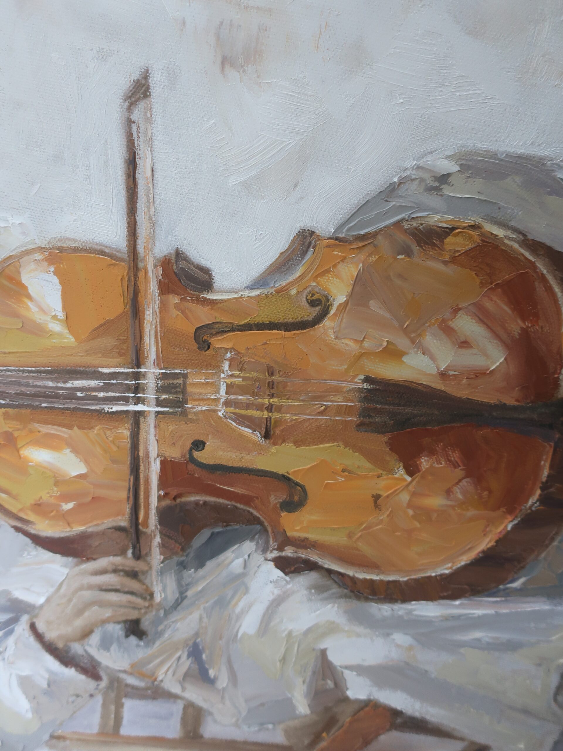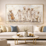 - Visual Contrast: The dominant white tones—symbolizing purity and holiness—beautifully contrast with the warm, deep hues of the instruments. The golden wood of the cello and the earthy tones of the drum create captivating focal points that draw the eye.
