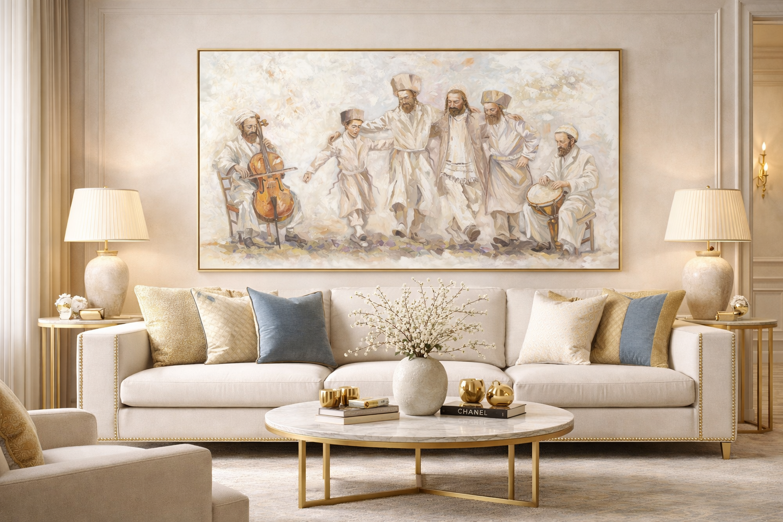 Impact in a Space: Due to its impressive size (1.5 meters wide), this painting is a true “showstopper” and serves as a central design element. It radiates an atmosphere of spiritual elevation, balanced joy, and deep Jewish serenity.