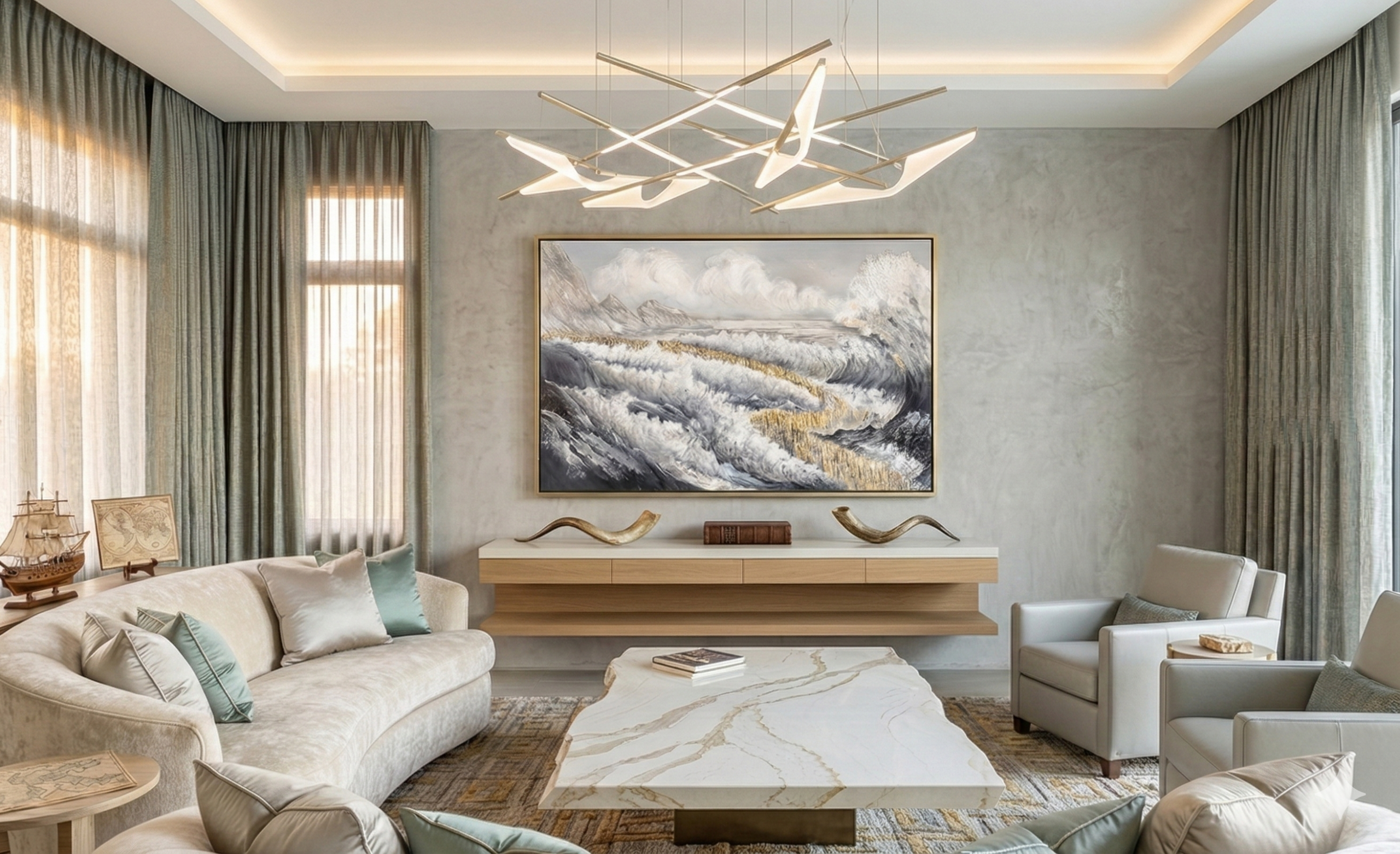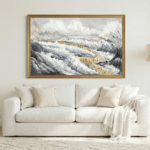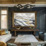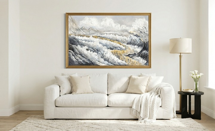 Breaking away from traditional blues, this piece is built on a sophisticated base of cream, white, and grey. This choice creates a clean, high-end look that fits perfectly in any modern luxury space.