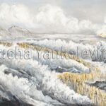 The most dramatic element is the use of pure gold accents. They form the “Path of Salvation”—a brilliant, shining trail where the People of Israel, depicted as glowing gold points, march between the towering walls of water. This golden path creates a stunning contrast against the grey, turbulent sea, symbolizing the light, holiness, and Divine Providence that guides us through our darkest moments.